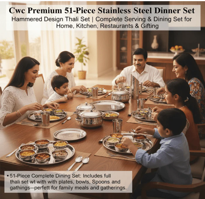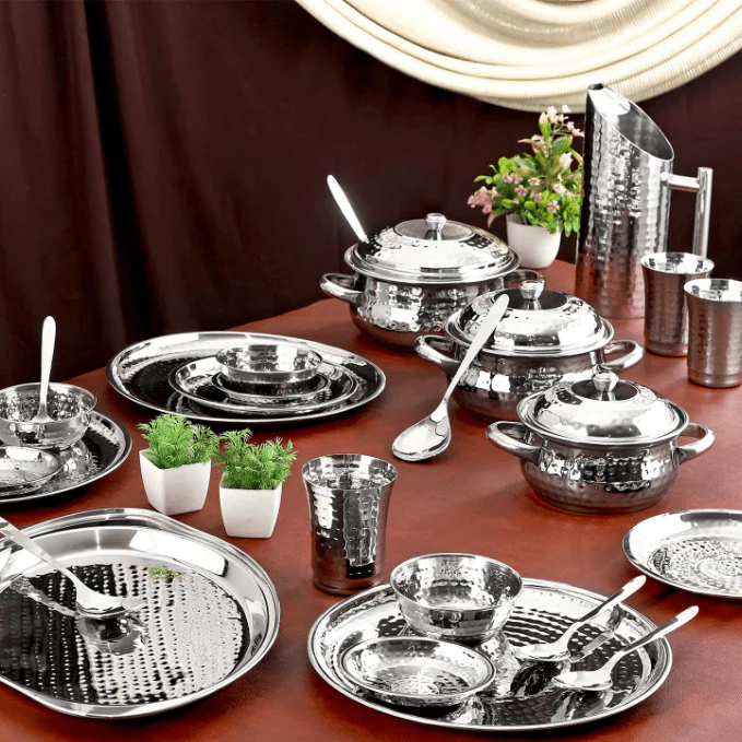 Elevate your culinary presentation with our “Artisanal Hammered” 51-piece collection. Each piece undergoes a specialized hammering process that not only creates a brilliant, multi-faceted shine but also hardens the steel for extra durability. This set is designed for those who appreciate the tactile beauty of textured metalware and want a dinner service that stands out from the ordinary.