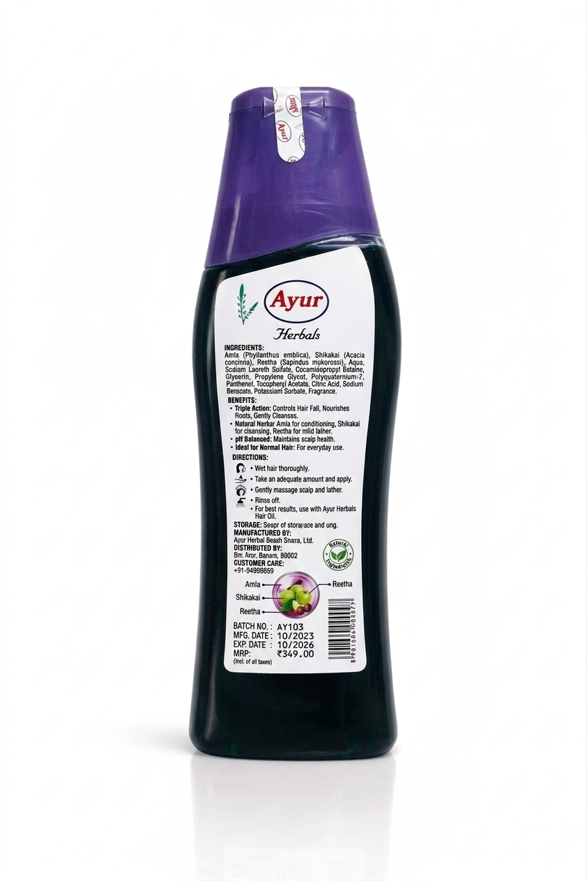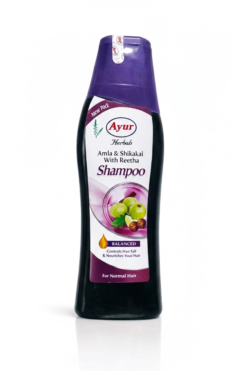 Ayur Herbals Amla & Shikakai with Reetha Shampoo. Specifically formulated for normal hair types, this shampoo uses a triple-action herbal formula to address common hair concerns naturally.