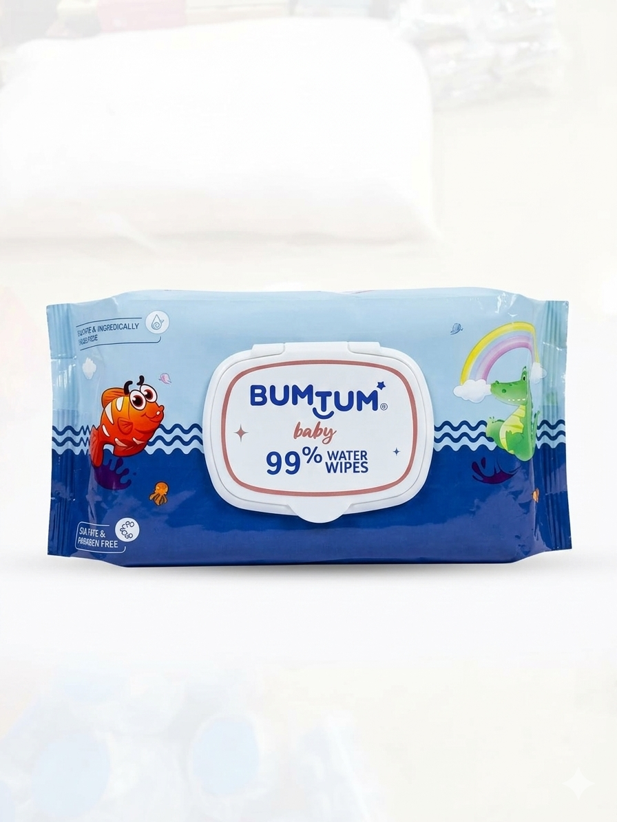 Bumtum Baby 99% Water Wipes. We understand that a baby’s skin is extremely thin and sensitive, which is why our wipes are formulated to be free from harsh chemicals and irritants.