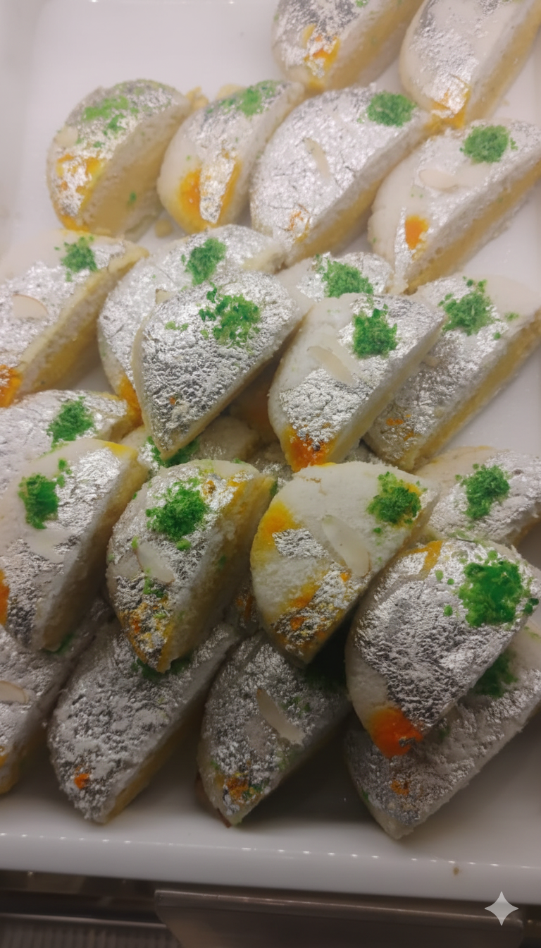 🍯 Decadent Filling: The “sandwich” is filled with a signature mixture of saffron-infused khoya or thick cream, providing a deep, milky flavor that perfectly complements the light outer layers.