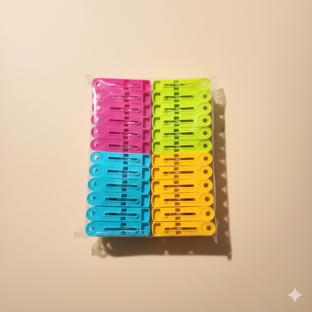 This value pack of plastic cloth clips is an essential for laundry day. The set comes with a large number of clips in four bright, vibrant colors—pink, green, blue, and yellow—making them easy to spot. Each clip is made from durable, sturdy plastic and features a strong spring mechanism to provide a firm grip on your clothes. They are perfect for securely hanging everything from heavy jeans and towels to delicate items on your clothesline, preventing them from slipping or blowing away in the wind.