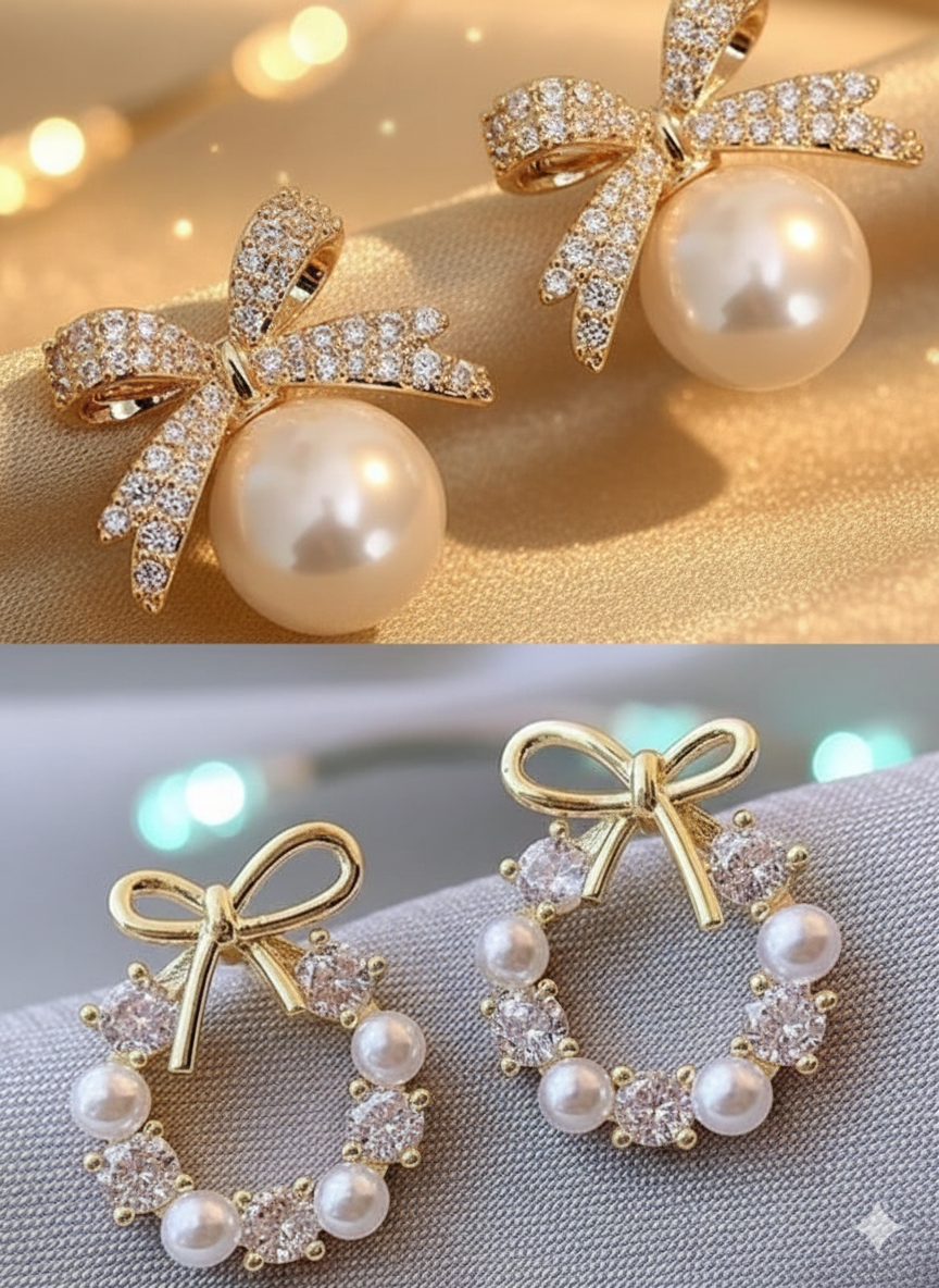 - Charming Bow & Pearl Wreath Studs (Bottom Pair): 🎀 These delightful stud earrings showcase a delicate gold-tone bow atop a charming wreath design. The wreath is intricately embellished with alternating sparkling crystals and dainty faux pearls, creating a sophisticated yet playful aesthetic. Ideal for a refined look or as a thoughtful gift.