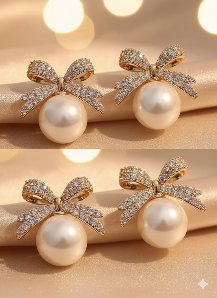 - Sparkling Bow & Pearl Drops (Top Pair): ✨ These enchanting earrings feature a meticulously crafted gold-tone bow adorned with brilliant pave-set crystals that catch the light with every movement. Suspended gracefully beneath each bow is a luminous faux pearl, exuding classic elegance and a timeless appeal. Perfect for special occasions or adding a chic touch to your daily wear.