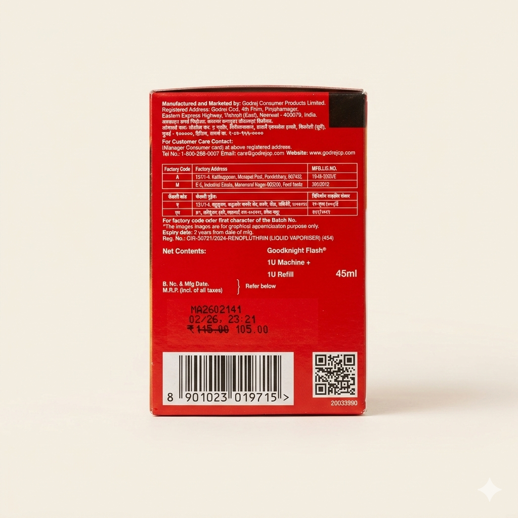 New Goodknight Flash Liquid Vaporiser. Designed by Godrej, this advanced mosquito repellent system is crafted to tackle even the hidden mosquitoes in your room. The “Flash Mode” technology allows for a more potent release of the vaporiser when you need it most, effectively clearing out pests so you can relax. Whether you are working, sleeping, or spending time with family, Goodknight Flash offers a reliable shield against mosquito-borne discomfort.