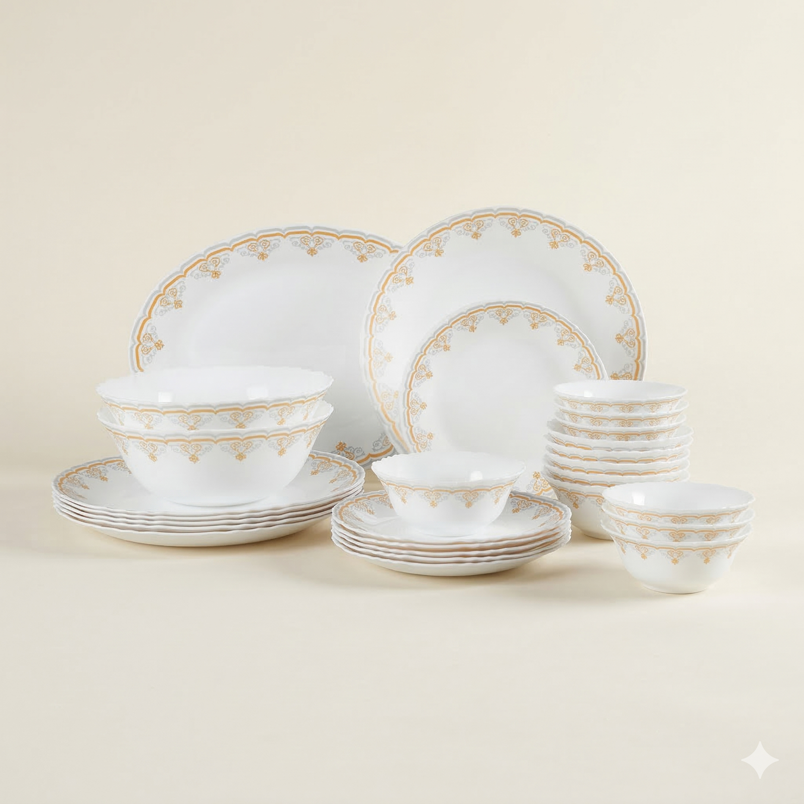 Transform every meal into a special occasion with our Golden Radiance Opalware Collection. Designed for those who appreciate the finer details, this set features a delicate, vintage-inspired scalloped edge adorned with a sophisticated gold lace pattern.