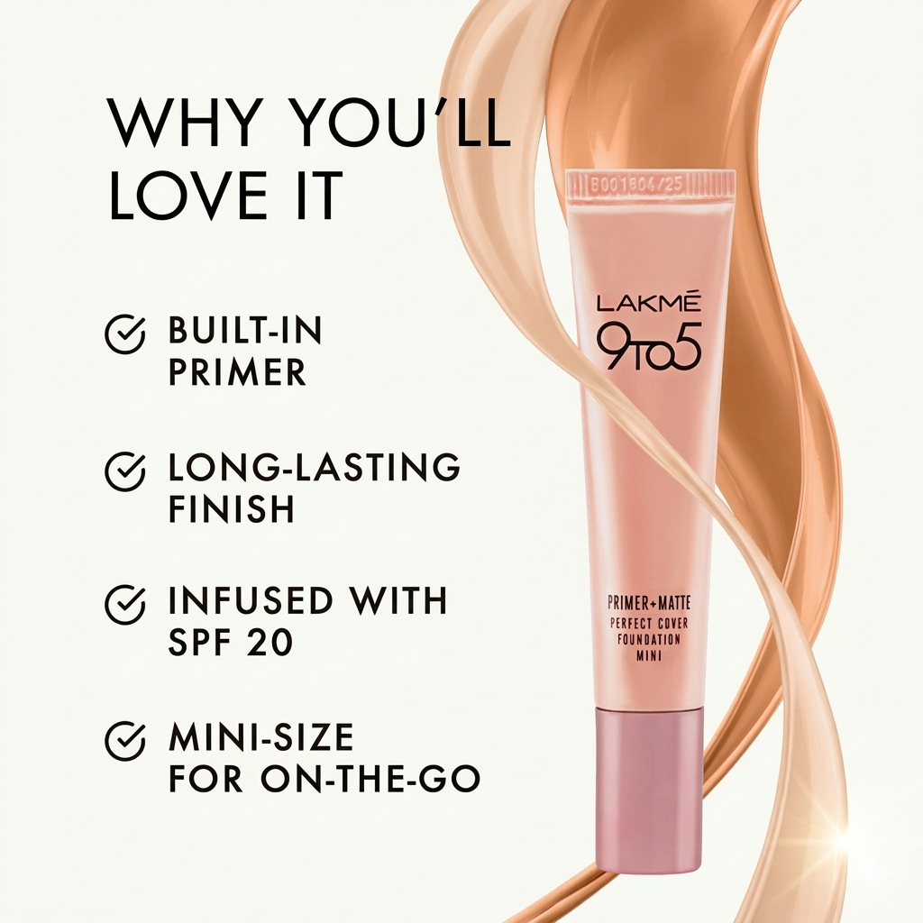 Lakmé 9to5 Primer + Matte Perfect Cover Foundation is specifically designed to simplify your beauty regimen. By integrating a built-in primer, it blurs pores and fine lines while providing a high-pigment, buildable coverage that looks like a second skin.
