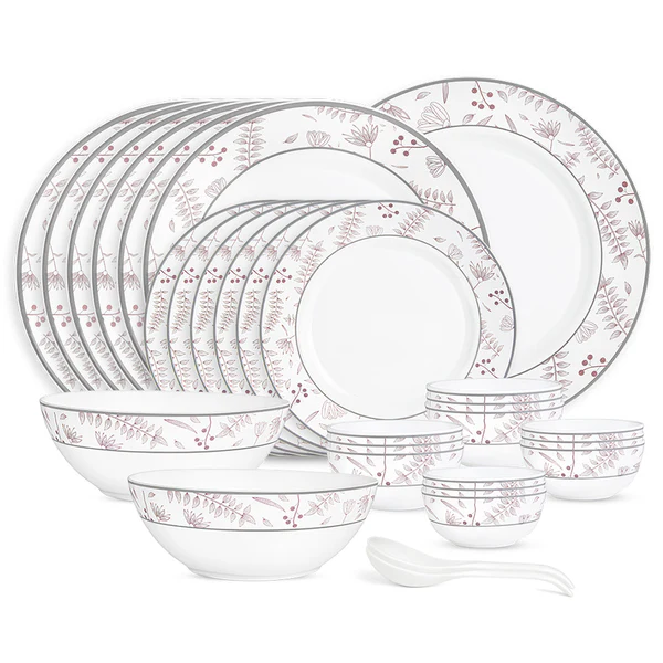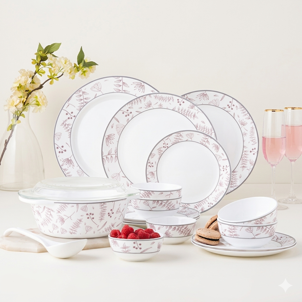 Bring a touch of serene luxury to your table with the Meadow Frost Dinner Set. Featuring a delicate lavender botanical motif on a crisp bone-white finish, this premium opalware collection is the perfect balance of modern elegance and daily durability.