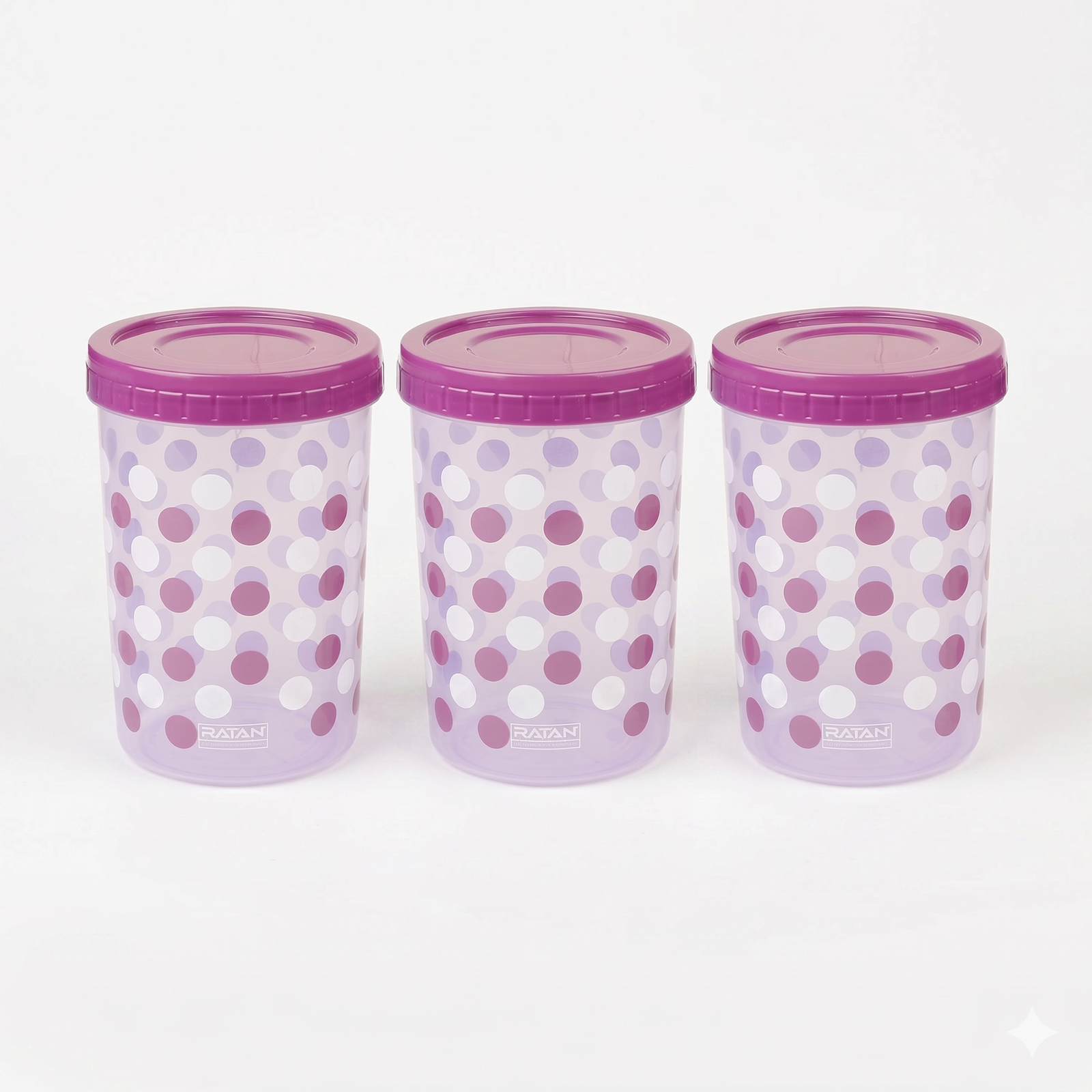Ratan Polka-Dot Collection. This set of three matching containers is designed to be as beautiful as it is practical. The translucent body allows you to see your contents at a glance, while the playful polka-dot design adds a pop of personality to any room.