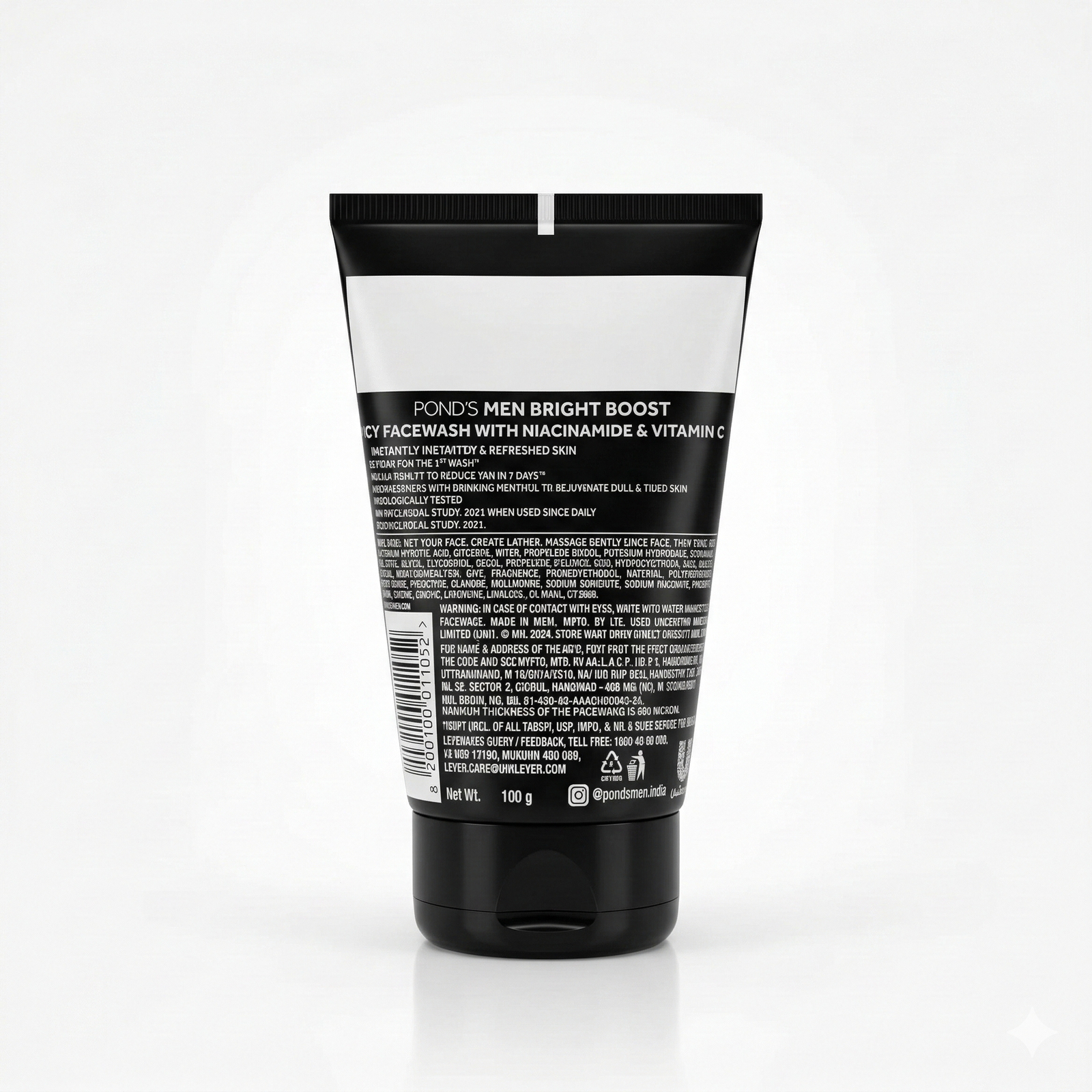 Glow Up Instantly with Pond’s Men Bright Boost! Kickstart your day with the ultimate 2-in-1 solution for dull skin. Infused with the power of Niacinamide and Vitamin C, this icy facewash removes deep-seated dirt, oil, and pollution, leaving your face feeling refreshed and looking visibly brighter from the very first wash.