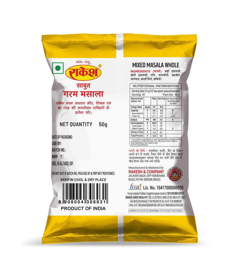 Rakesh Garam Masala Whole is an essential Mixed Masala Whole blend, combining high-quality, aromatic spices like cardamom, cloves, cinnamon, and more. This blend is designed for those who prefer to grind their Garam Masala fresh at home, ensuring the maximum possible potency, flavor, and fragrance in their cooking. Rakesh maintains its promise of Fine Quality and has been a trusted brand since 1975.