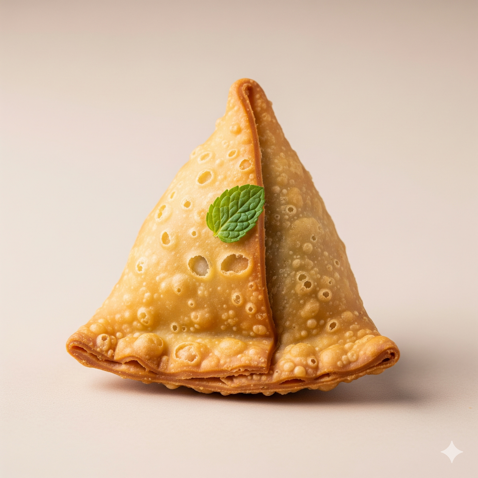 Resting gracefully upon its side is a single, fresh mint leaf. 🌿 This vibrant splash of cool green provides a striking visual contrast to the warm tones of the pastry. It adds a touch of life and elegance, hinting at the fresh, savory, and perhaps spicy flavors of the potato and pea filling hidden within. 😋