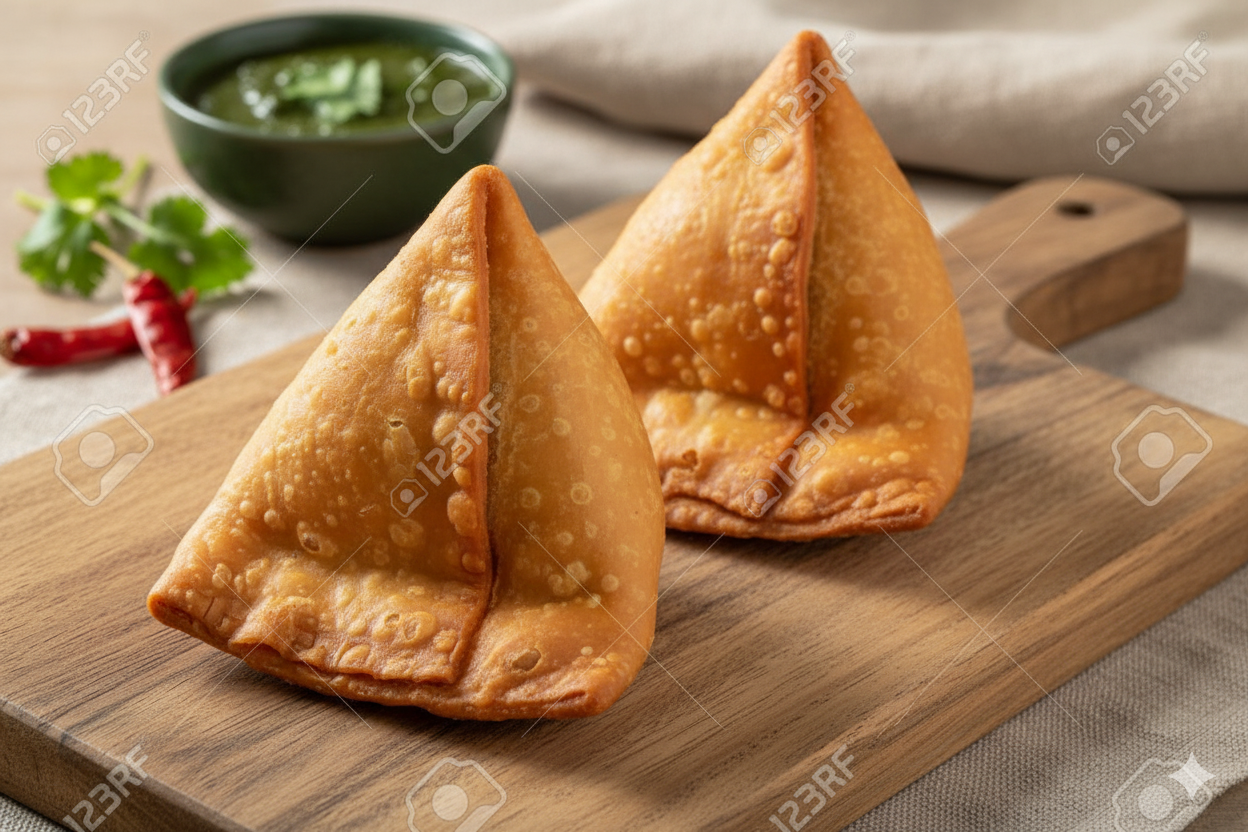 All of this culinary artistry is set against an impeccably clean, smooth, and solid light-beige background. 🎨 This minimalist and modern choice strips away all distractions, forcing the viewer’s eye to focus entirely on the tempting form, color, and texture of the solitary samosa. The composition is simple yet sophisticated, making this humble and beloved snack look incredibly appetizing and like a true work of art. 🇮🇳
