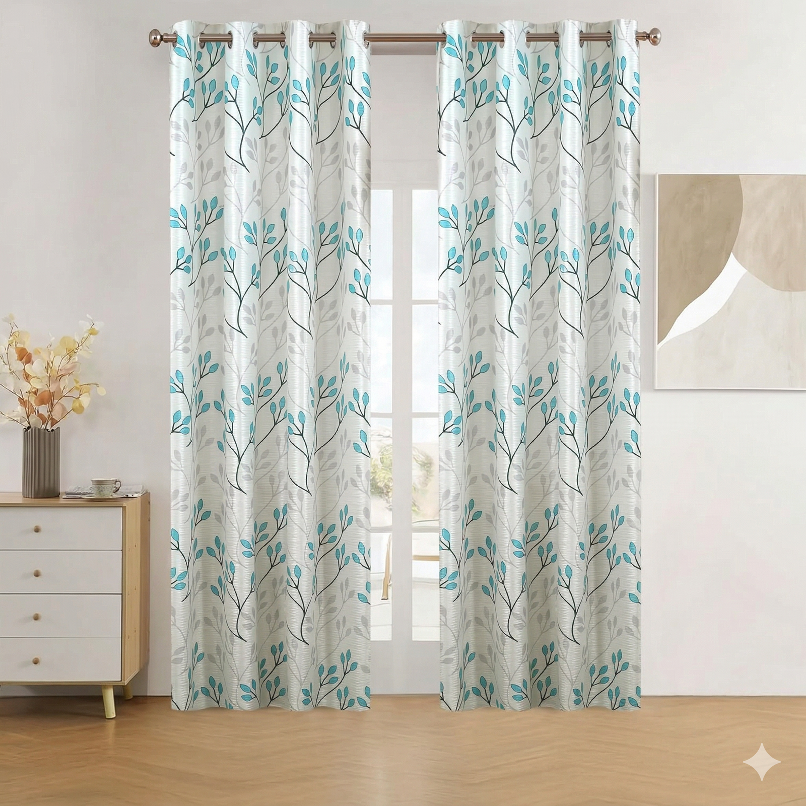 Transform your home into a tranquil sanctuary with our Botanical Breeze Eyelet Curtains. These aren’t just window dressings; they are an invitation to relaxation. Featuring a delicate, hand-painted style vine pattern in soothing teal and subtle grey, these curtains bring the refreshing essence of a spring garden directly into your living space.