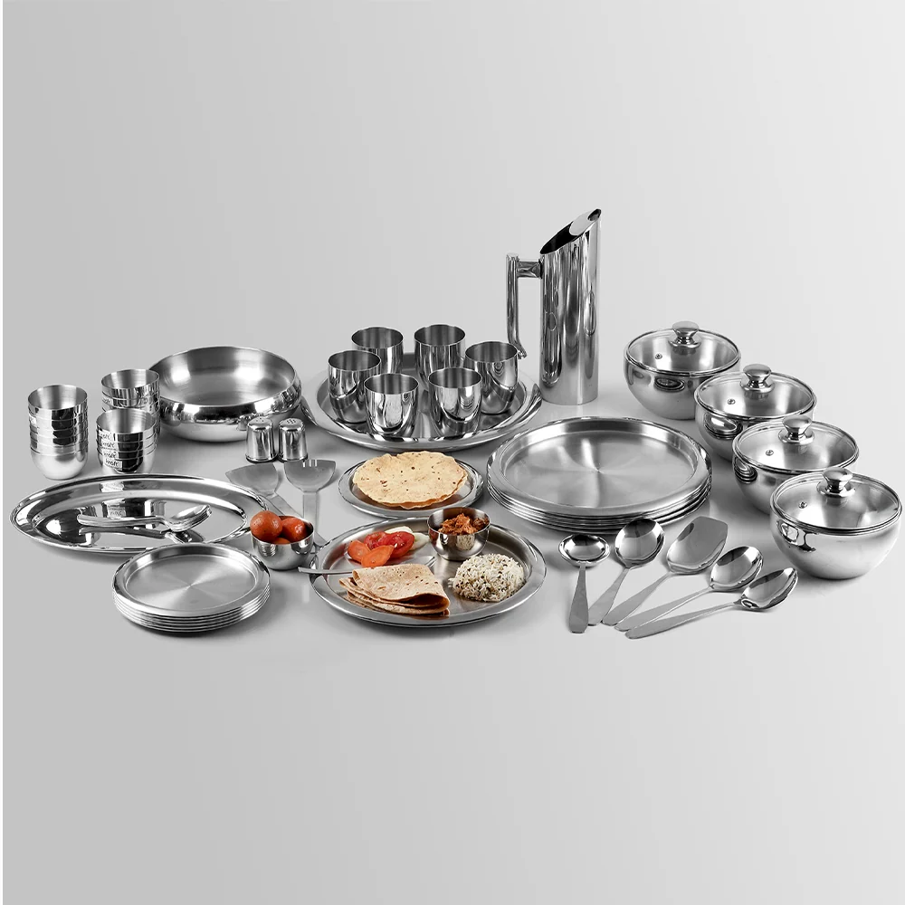 Bring home the timeless elegance of stainless steel with our “Royal Banquet” 61-piece mega set. This collection is specifically curated to cater to large families and those who love to host. Each piece features a brilliant mirror polish and heavy-duty construction, ensuring it remains a centerpiece of your kitchen for generations.
