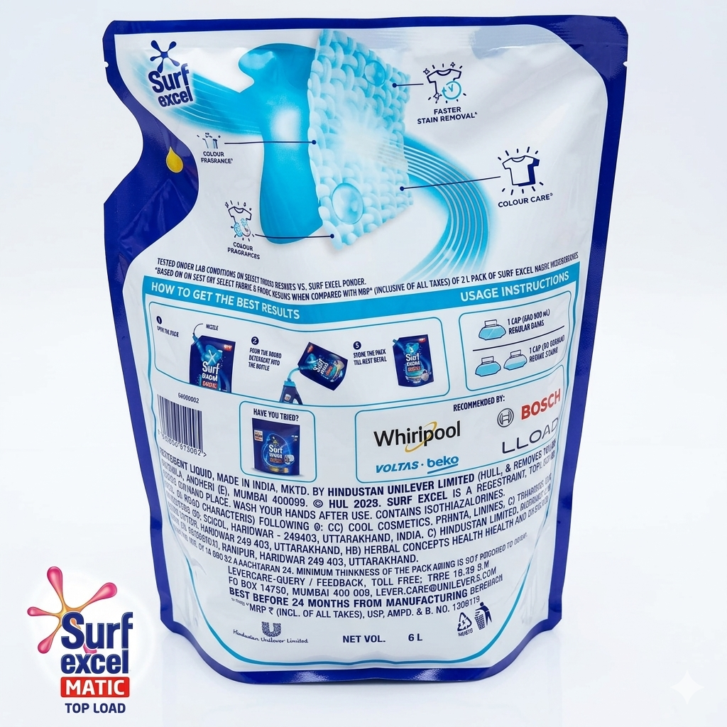 Professional Cleaning for Your Home Surf Excel Matic Top Load Liquid gives you a professional-grade clean with every wash. Unlike traditional powders that can struggle to dissolve and leave white streaks on dark fabrics, this advanced liquid formula is designed to move through the wash cycle smoothly. It targets stains at the source, ensuring that your whites stay bright and your colors remain vibrant.