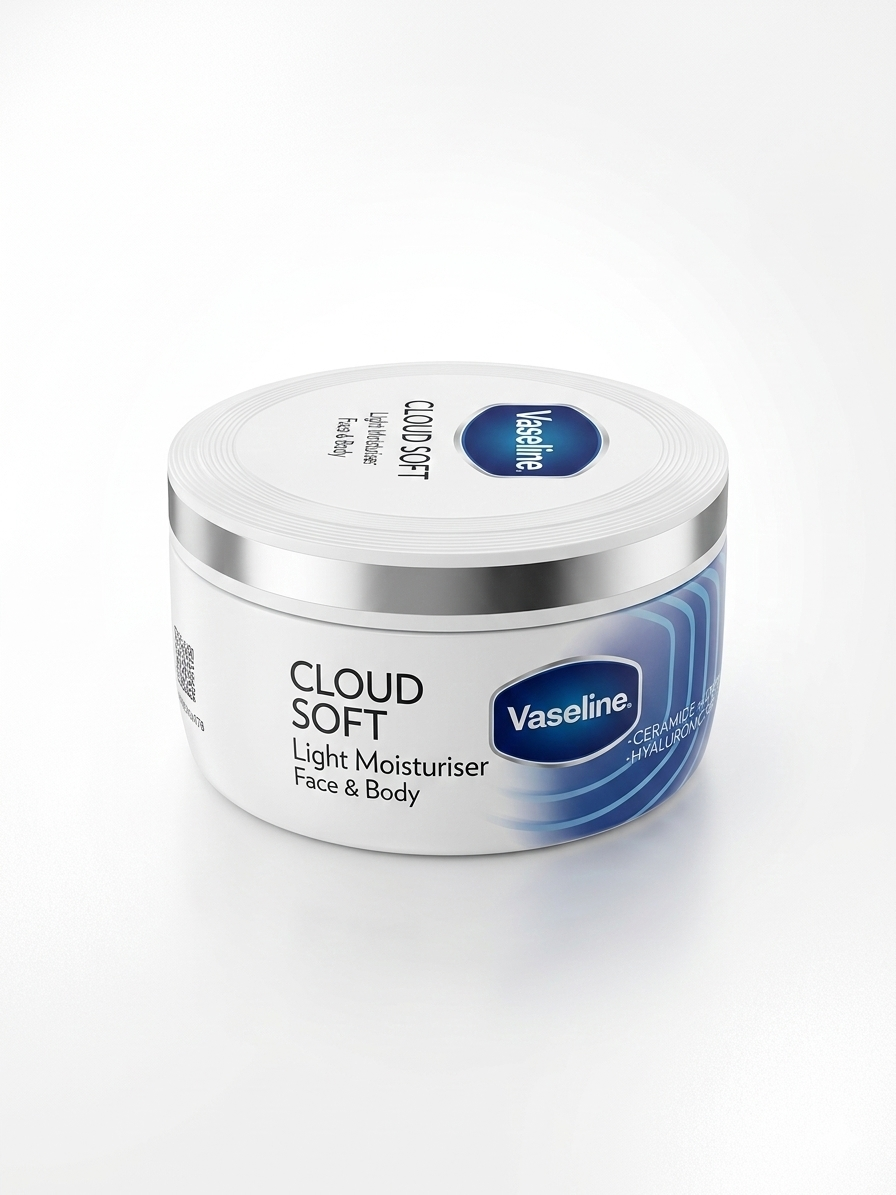 Vaseline Cloud Soft Light Moisturiser. Its lightweight formula absorbs quickly and provides long-lasting moisture without feeling greasy, leaving your skin soft like clouds.