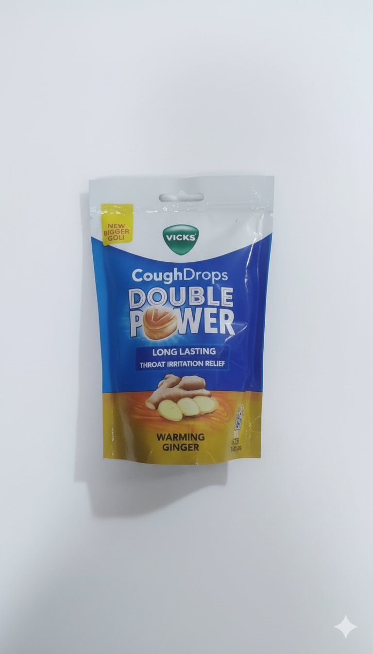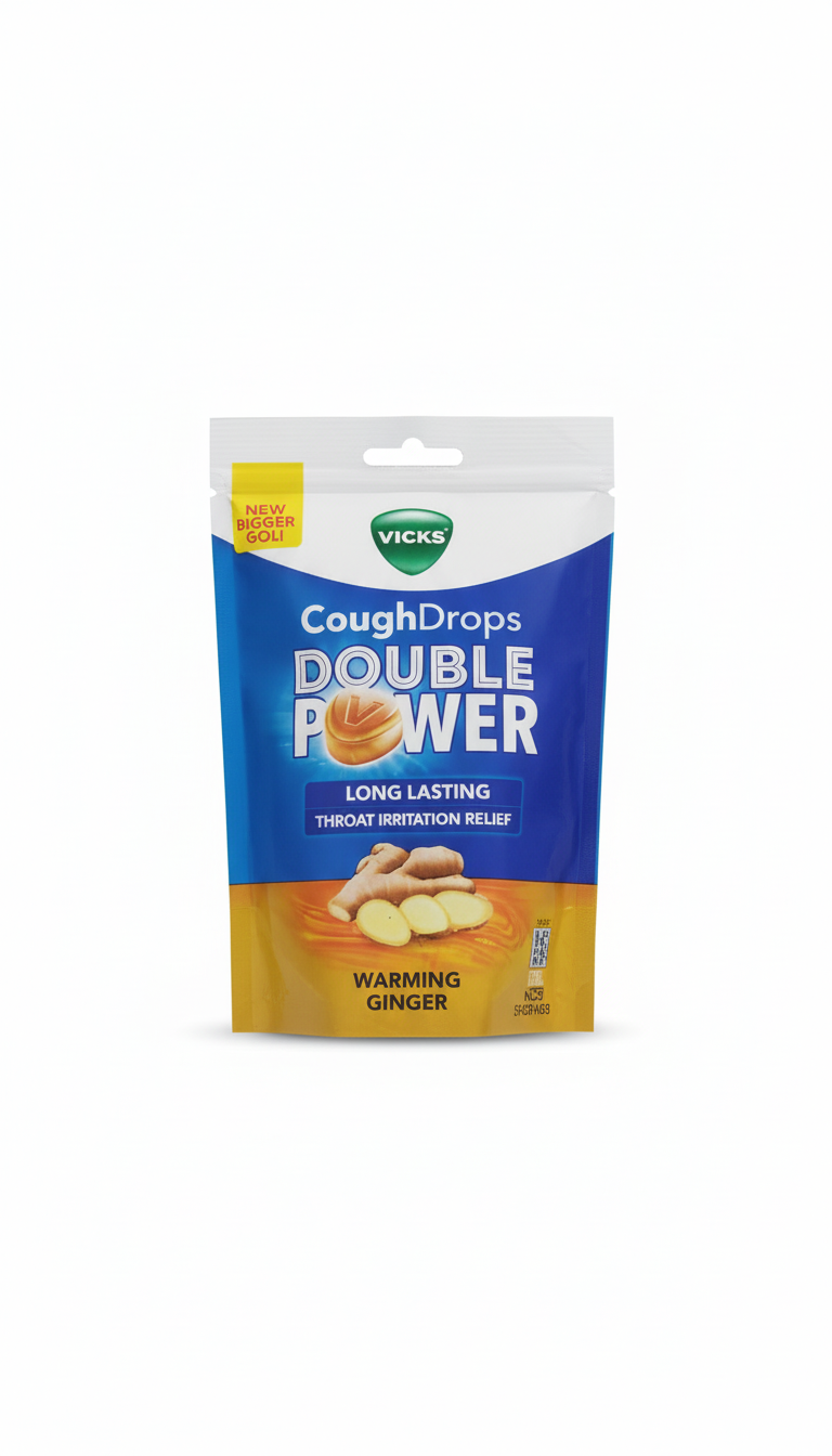 Tackle tough coughs and throat irritation with Vicks Double Power Cough Drops in a revitalizing Warming Ginger flavor. The special “Double Power” formula works hard to soothe your throat, while the new bigger drop size ensures the comforting effect is long-lasting. Perfect for on-the-go use, the convenient resealable bag keeps them fresh and ready whenever you need relief.