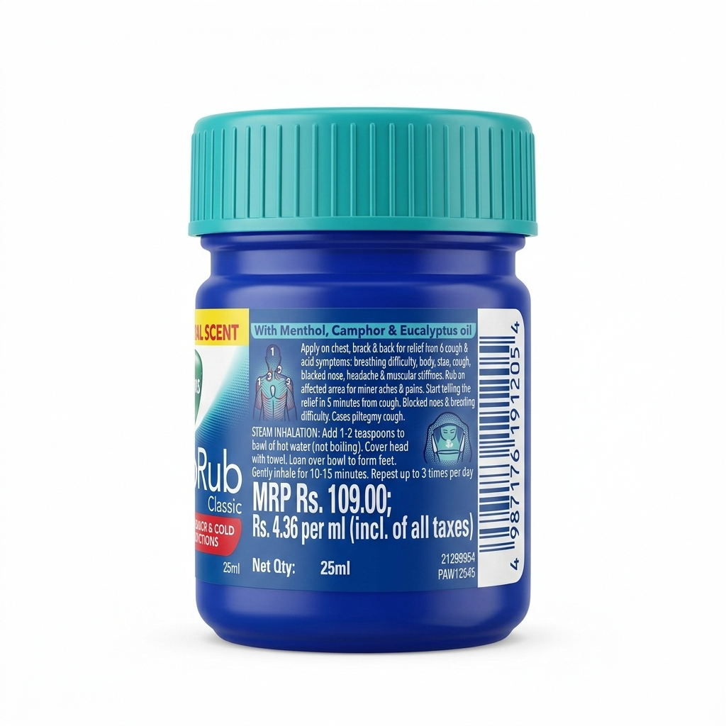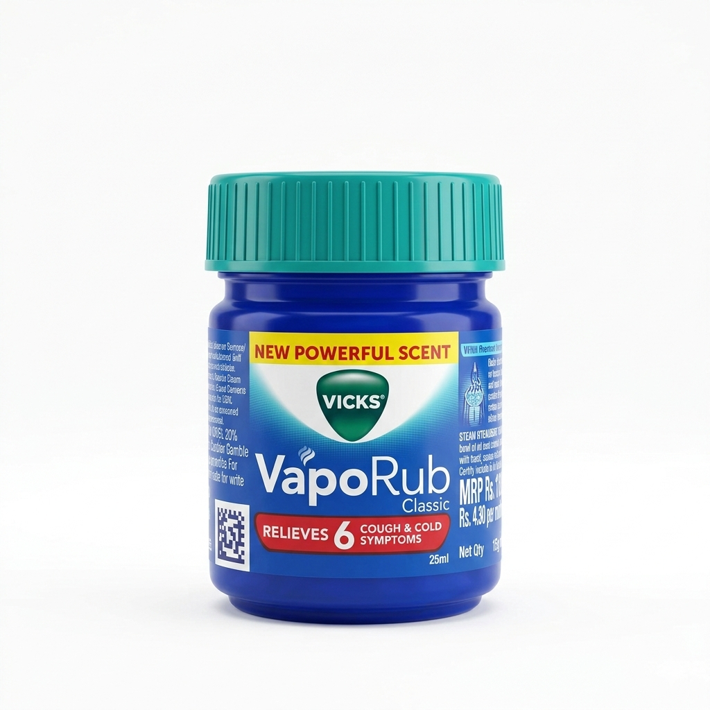 Vicks VapoRub Classic, a household staple for generations. This 25ml jar contains a potent formula specifically engineered to tackle the most stubborn symptoms of the common cold. Whether applied as a rub or used through steam inhalation, it provides fast-acting relief so you can breathe easier and rest better.